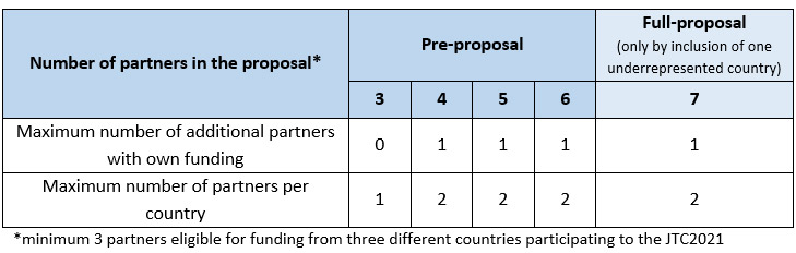 Research groups not eligible for funding (e.g. from non-funding countries or not fundable according to regional/national regulations of the participating funding organisation) may participate in transnational projects if they are able to secure their own funding. They are considered as full partners and have to be integrated in the pre- and full-proposal templates as such. No more than one partner with own funding is allowed in consortia with at least 3 partners that are eligible for funding.