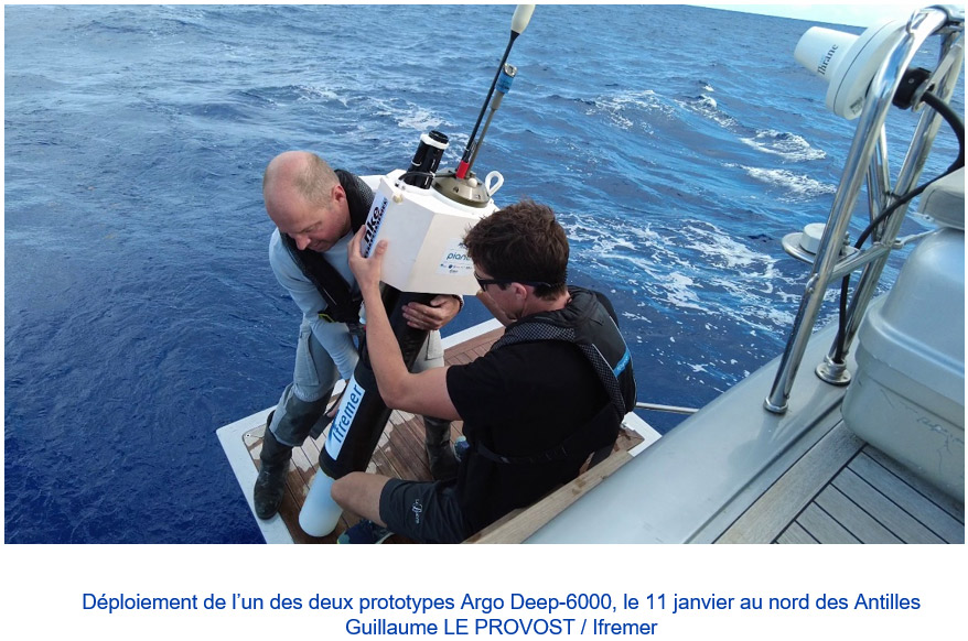 Les deux premiers prototypes ont été déployés le 11 janvier depuis un voilier affrété par la société OCEOPS, spécialisée dans l'organisation de campagnes scientifiques à la voile. Largués à l'aplomb d'une fosse océanique à trois jours de navigation au nord des Antilles, ils ont plongé en autonomie jusqu'à 6000 mètres avant de transmettre leurs données par satellite aux équipes à terre.